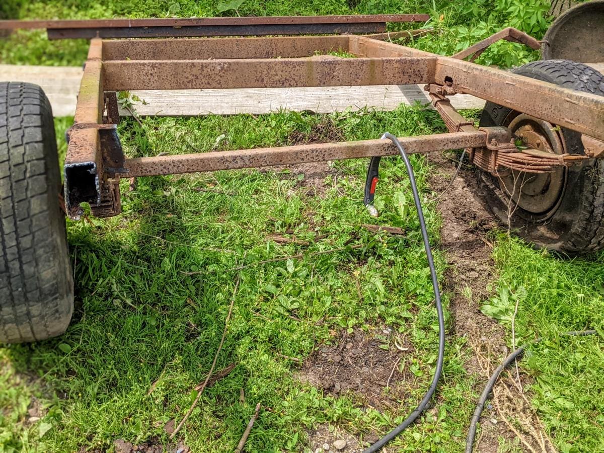 As with many projects here, I start in the junkyard. I needed a stout trailer axle and my neighbor let me drag an old wreck out of the weeds. The donor trailer fell apart as it limped home behind the tractor, with the wheels seized and one tire blown out. But it had a heavy duty drop axle, just the right size for my project. With a lot of torching, cutting, sledge-hammering, and a little finesse, I had my axle.