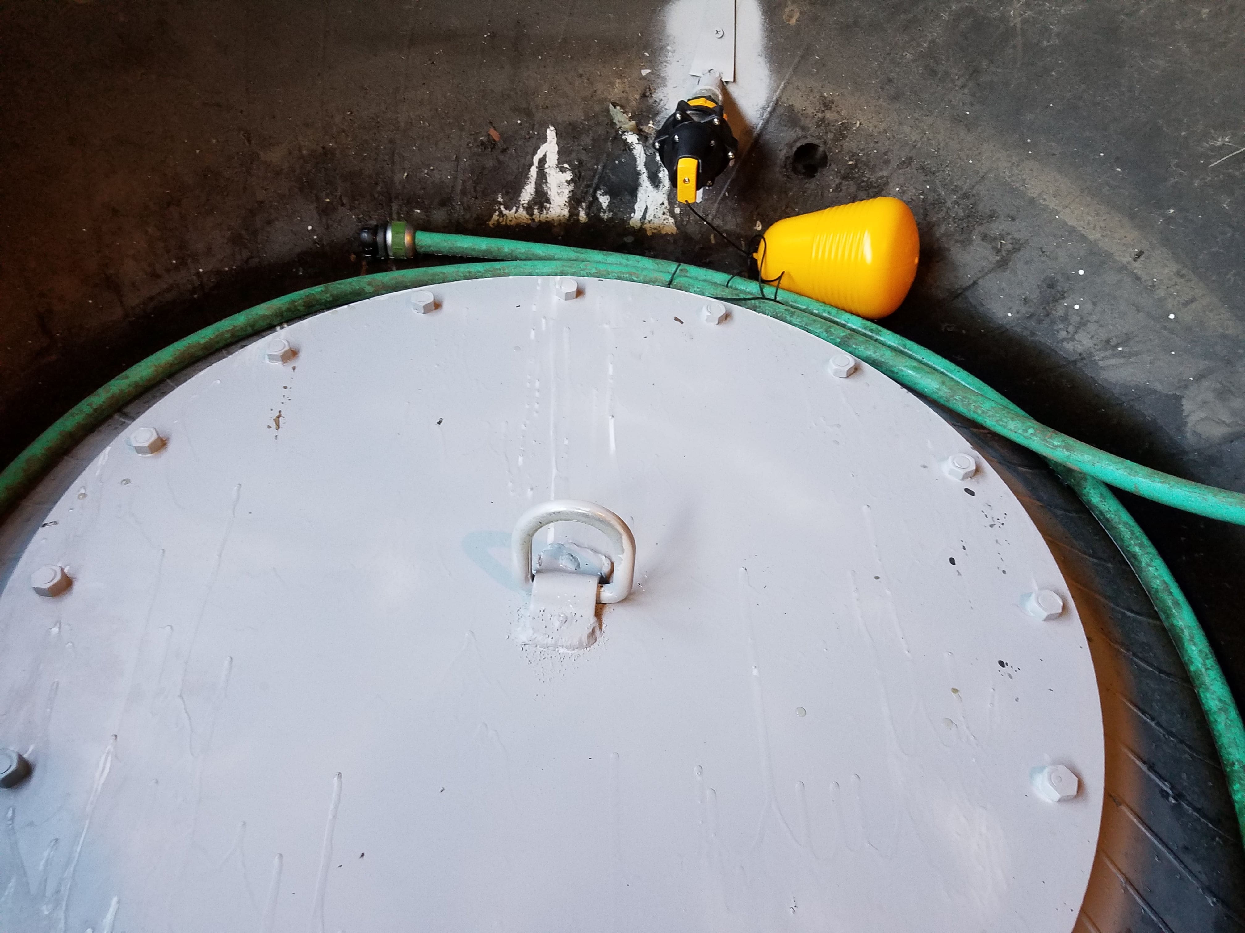 I removed the top sidewall with a reciprocating blade and used an angle grinder to remove any small reinforcing wire. For the bottom, I installed a 1/4″ plate and drilled it with 1/2″ holes. I used carriage bolts in the tire bead that passed up through the plate. The carriage bolt heads dig nicely into the tire and create a water tight seal. 3/8″ bolts would probably have been fine, but I had a box of 1/2″ hardware left over from another project. Because this is a low pressure application, I might have been able to rely on the tire bead for the sealing, but I applied a generous coating of silicone caulk to the interface between the steel plate and the rubber as insurance.
